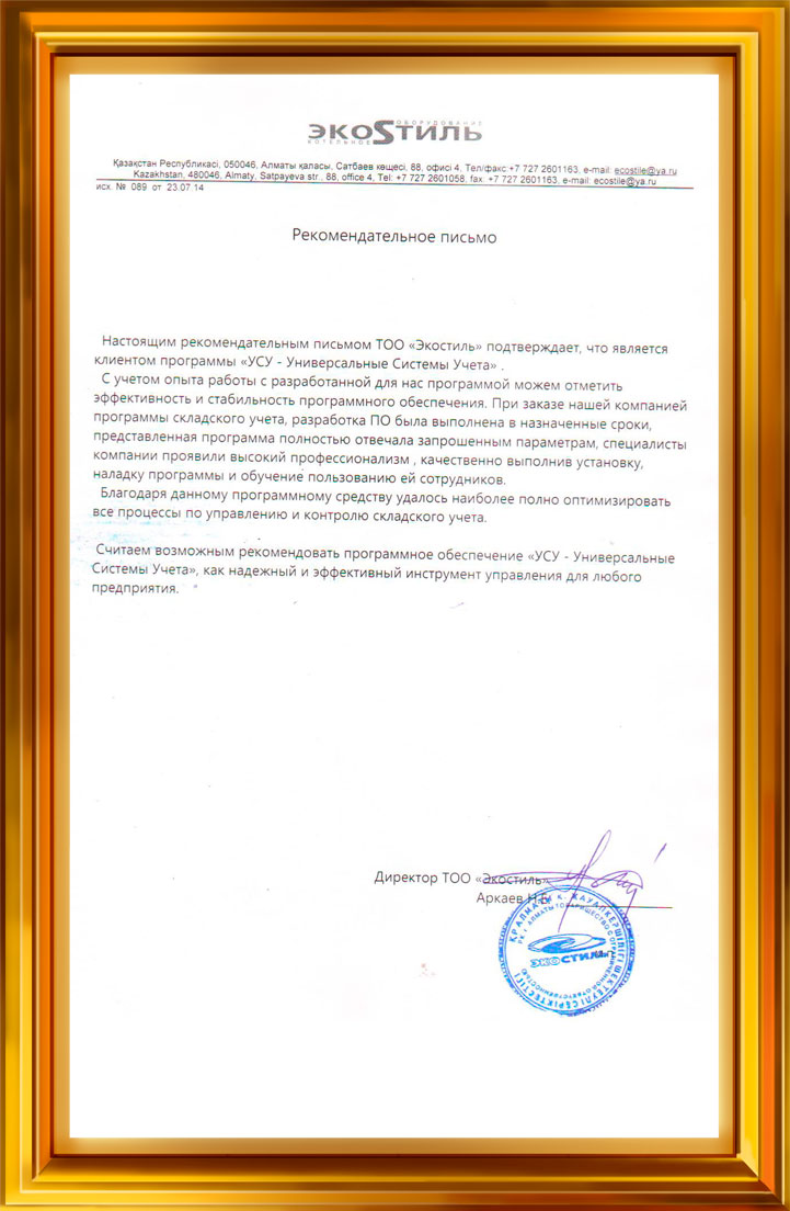 Настоящим рекомендательным письмом ТОО «Экостиль» подтверждает, что является клиентом программы «УСУ – Универсальные Системы Учета».
