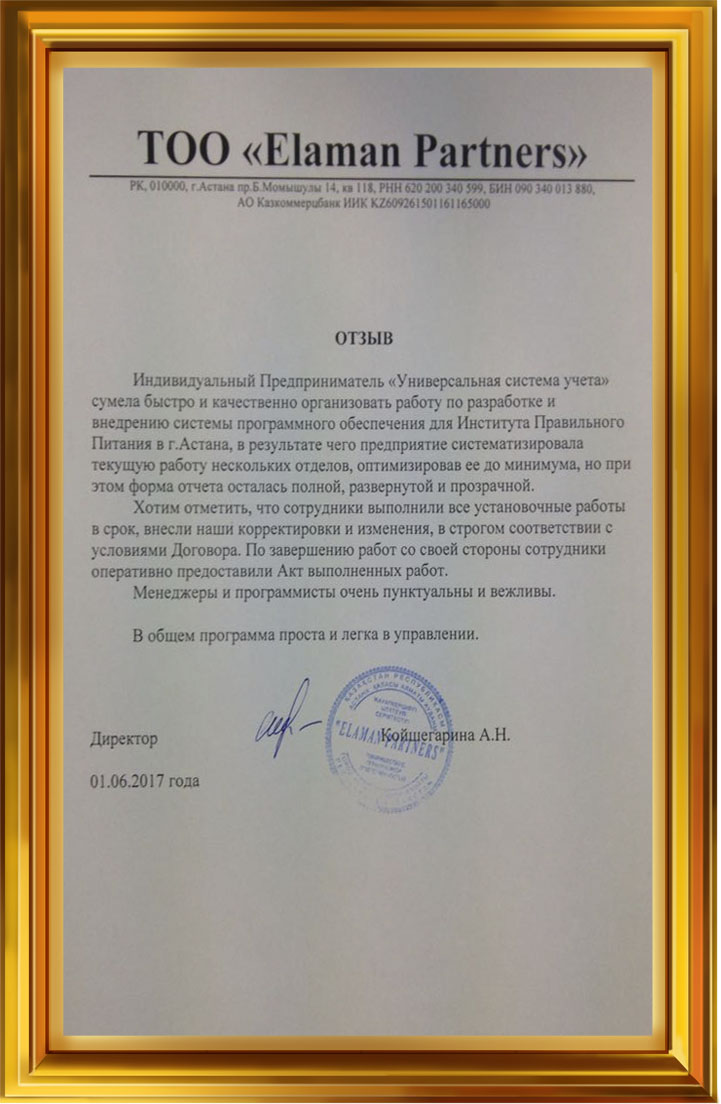 Индивидуальный предприниматель «Универсальная Система Учета» сумела быстро и качественно организовать работу по разработке и внедрению системы программного обеспечения для Института Правильного Питания в г. Астана, в результате чего предприятие систематизировала текущую работу нескольких отделов, оптимизировав ее до минимума, но при этом форма отчета осталась полной, развернутой и прозрачной.