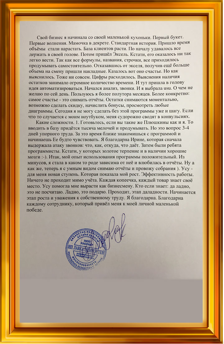 По началу удавалось все держать в своей голове. Потом пришёл Эксель. Кстати, его оказалось ни так легко вести. Так как все формулы, названия, строчки, все приходилось продумывать самостоятельно. Отказавшись от экселя, получив ещё больше объема на смену пришли накладные. Казалось вот оно счастье. Но как выяснилось. Тоже ни совсем. Цифры расходилось. Выяснения наличия остатков занимало огромное количество времени. И тут пришла в голову идея автоматизироваться. Начался анализ, звонки. И я выбрала usu. О чем не желаю по сей день. Пользуюсь я более полутора месяцев. Более конкретно: самое счастье - это снимать отчёты. Остатки снимаются моментально, возможно сделать скидку, начислить бонусы, просмотреть любые диаграммы. Сегодня я не могу сделать без этой программы уже и шагу. Если что то случается с моим ноутбуком, меня судорожно сводят в конвульсиях.