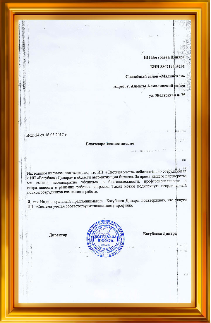 Свадебный бутик Малинелли (ИП Богубаева Динара) выражает сердечную благодарность компании ИП Акулов Н.Н. за установку на нашем предприятии программы Универсальная Система Учета.
