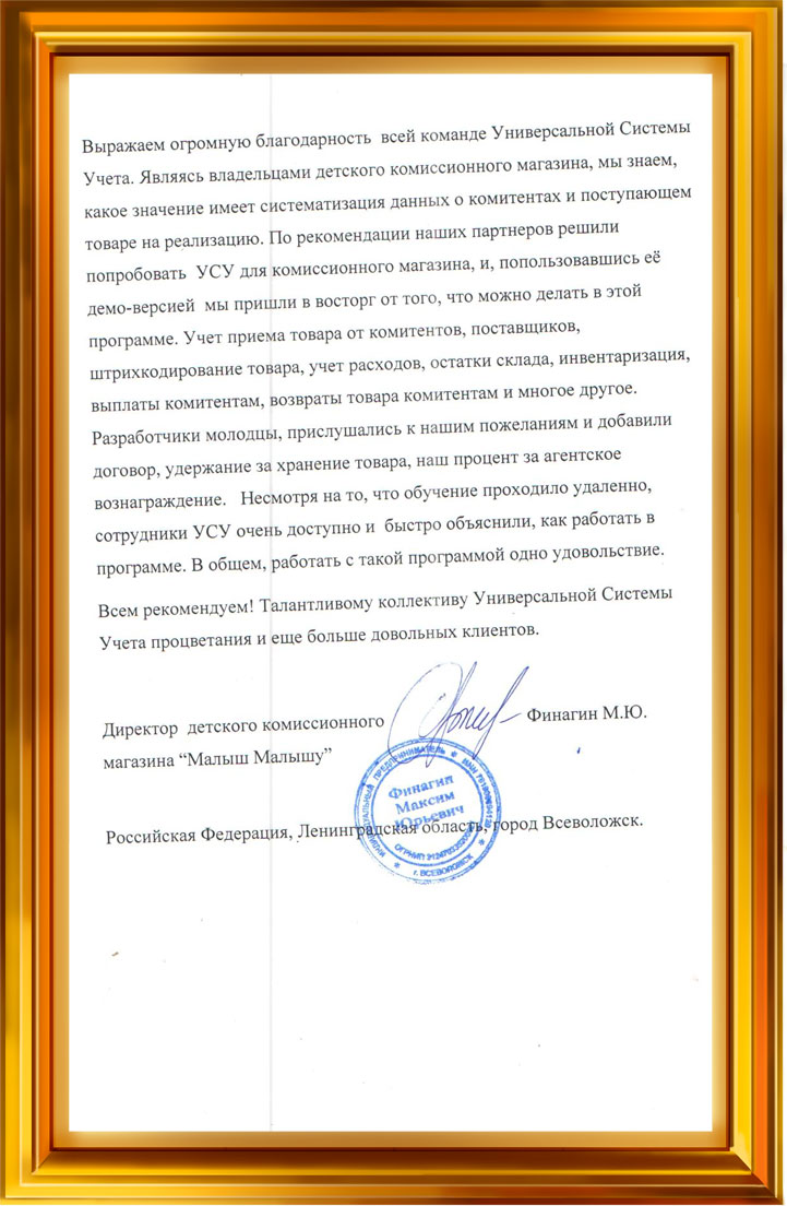 Выражаем огромную благодарность всей команде Универсальной Системы Учета. Являясь владельцами детского комиссионного магазина, мы знаем, какое значение имеет систематизация данных о комитентах и поступающим товаре на реализацию. По рекомендации наших партнеров решили попробовать УСУ для комиссионного магазина, и, попользовавшись ее демо-версией, мы пришли в восторг от того, что можно делать в этой программе.