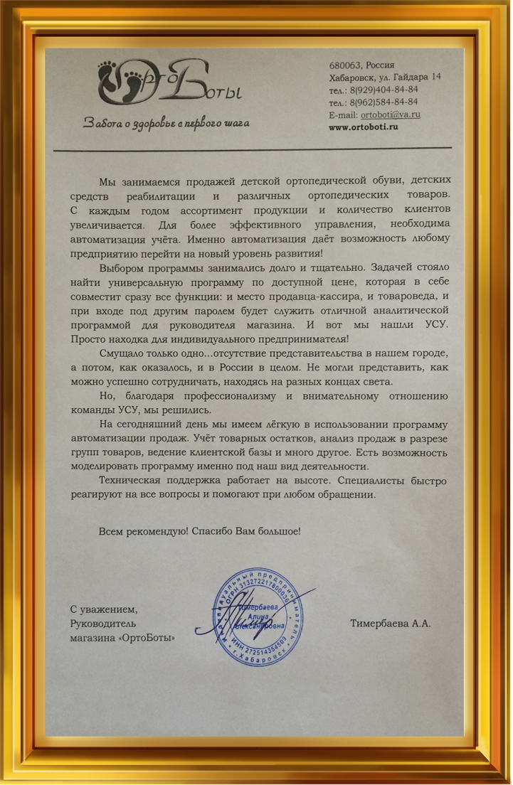 С уважением, Руководитель магазина «ОртоБоты» Тимербаева А.А.